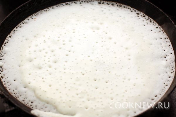 Тесто должно получиться довольно жидким, чтобы блины были тонкими. Если тесто получилось гуще, просто добавьте немного кефира до нужной консистенции