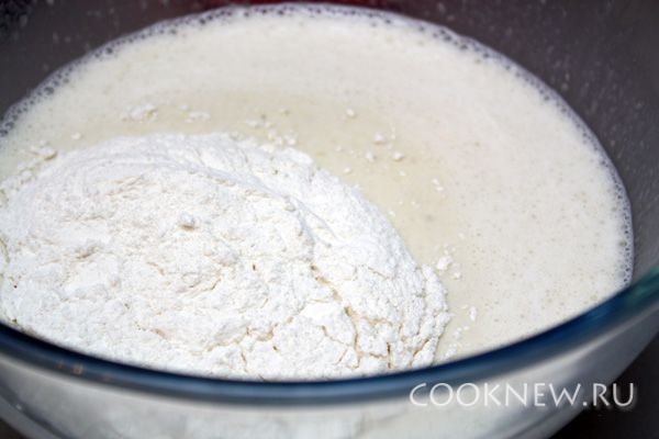 В банановую массу добавляем яйца, сахар, оставшееся молоко и масло. Все соединяем, затем кладем просеянную муку и хорошо размешиваем до однородности