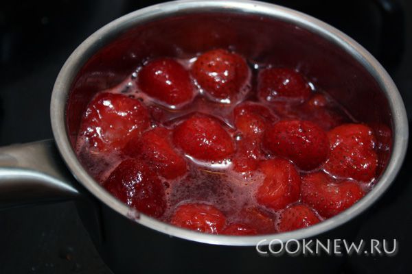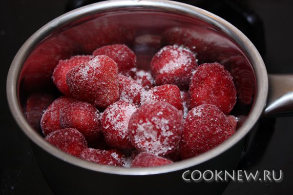 Теперь занимаемся соусом. Для этого берем клубнику (замороженная удобна тем, что готовить из нее можно круглый год), смешиваем ее с сахаром, и ставим на огонь. Это можно сделать даже не размораживая ягоды. Клубнику нужно разогревать до тех пор, пока не выделится и не закипит сок