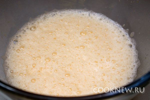 Соединяем яйца с сахаром и солью, тщательно взбиваем до такого состояния, как на картинке. Количество сахара подобрано оптимально для нейтрального вкуса, т.к. его очень любят дрожжи и в итоге сладкими они не будут