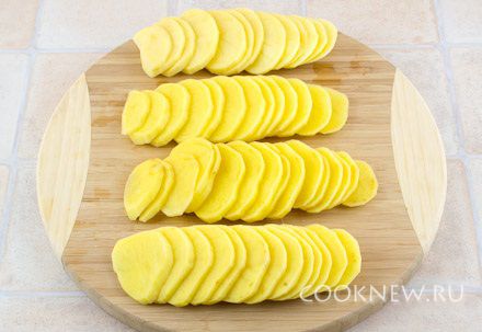 Картофель почистить, порезать тонкими кружочками толщиной 2-3 мм. Нарезка картофеля очень важна, слишком тонко нарезать не стоит (так чтобы пластинки просвечивались), но и толсто нарезать тоже не нужно