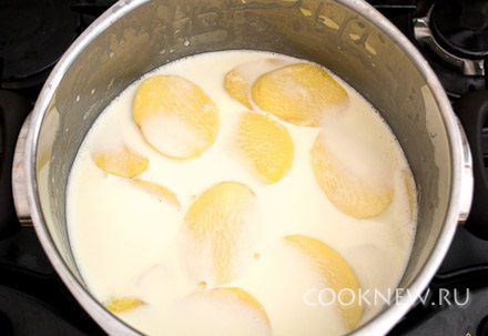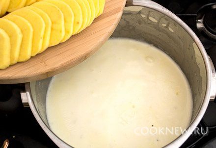 В кастрюлю налить сливки и молоко, положить чеснок, немного посолить. Довести до кипения, затем опустить картофель