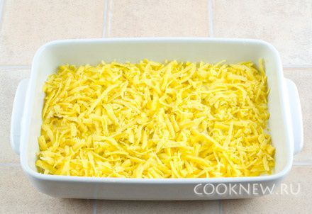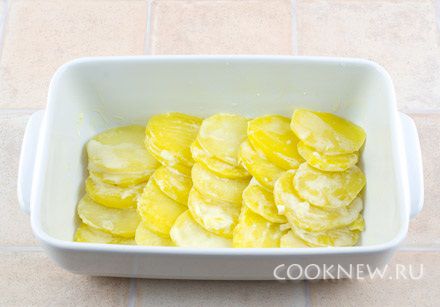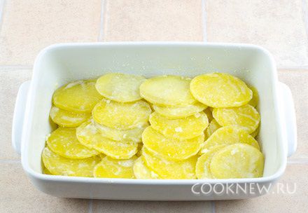 Форму обильно смазать маслом (у меня форма 21x14 см). Слишком маленькую по размерам форму брать не нужно, потому что весь картофель нужно выложить максимум в два ряда. Кружочки картофеля извлечь из кастрюли с помощью шумовки. Ложкой или вилкой (так как картофель горячий) выложить половину кружочков картофеля в один слой в виде черепицы. Посолить