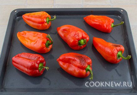 Перцы положить в форму или на противень. Поставить в разогретую до 220-230 градусов духовку. Запекать не более 15-20 минут, до подпалин не доводить. Перец не должен быть полностью запеченным, лучше немного не допечь, чем перепечь (потому что тогда он станет слишком мягким и будет распадаться на части). Запеченные перцы сразу переложить в пакет и завязать