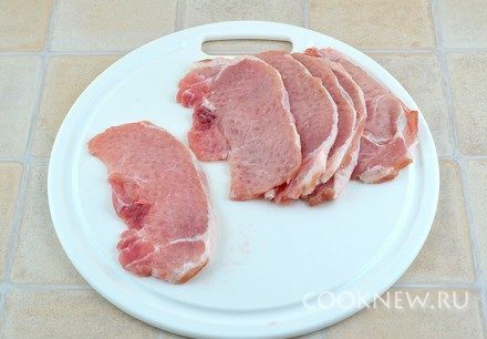 Мясо порезать на порционные ломтики шириной 0,5-1 см. Отбить каждый кусочек кухонным молотком. Затем посолить, поперчить