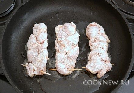 Каждую косичку обвалять в муке со всех сторон. Хорошо разогреть сковороду с растительным маслом. Выложить косички и жарить на большом огне 2-3 минуты