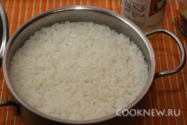 Заливаем чистой водой в соотношении 1 к 1,2 и ставим на большой огонь. Доводим до кипения на большом огне, затем накрываем крышкой и варим на маленьком огне 12-13 минут. Крышку не открываем и ничего не трогаем, выключаем огонь и даем настояться рису под крышкой еще 15 минут. После этого смешиваем рисовый уксус, соль и сахар и добавляем в рис