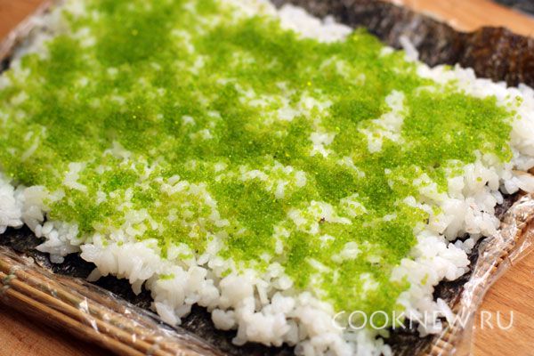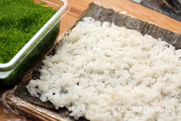 На половинку (или чуть больше) листа нори раскладываем рис ровным слоем, отступая 1-2 см от края с одной стороны