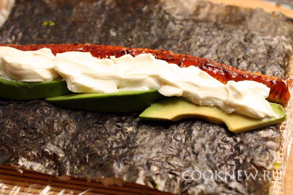 С помощью макису переворачиваем нори рисом вниз. На середину листа выкладываем начинку- авокадо, копченоый угрь и сливочный сыр