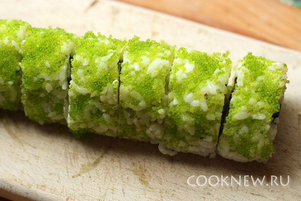 Забавные роллы урамаки рисом наружу в яркой зеленой оболочке из икры летучей рыбы