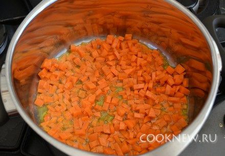 В кастрюлю с толстым дном налить растительное масло. Выложить морковь, жарить 3 минуты