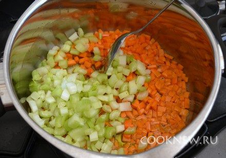 Добавить сельдерей, перемешать, жарить 5-10 минут, до мягкости овощей