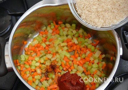 Добавить томатную пасту, красный молотый перец по вкусу. Посолить, поперчить, всыпать рис, перемешать