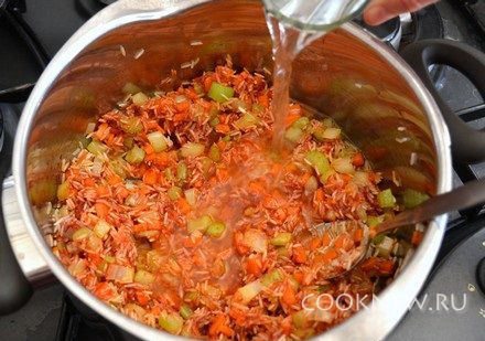 Влить 3 стакана воды (в три раза больше риса), довести до кипения. Варить на маленьком огне 15-20 минут или до выкипания всей жидкости, не перемешивать в процессе готовки