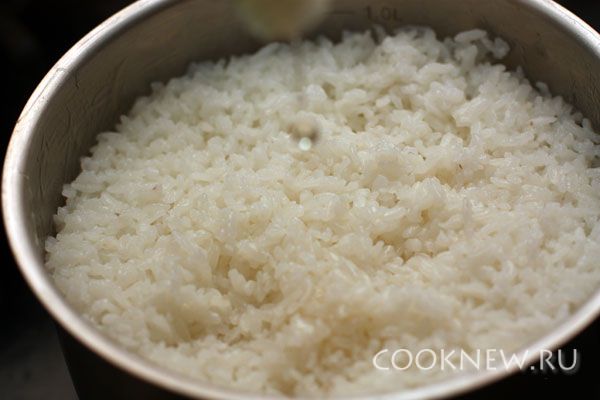 По окончании варки некоторое время держим рис под крышкой, чтобы он пропарился. Затем добавляем рисовую приправу для суши и перемешиваем. Хочу заметить, что бывает рисовый уксус без добавок, тогда к нему надо добавлять соль и сахар, а бывает готовая рисовая приправа, в которой это все уже есть и тогда нужно лить только ее