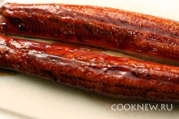 С угря лучше срезать шкуру, а затем нарезать его брусками толщиной примерно 1х1 см и длиной по размеру листа нори