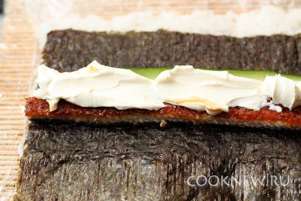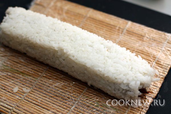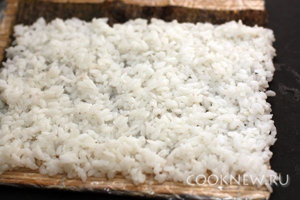 Половинку листа нори кладем на обернутый пищевой пленкой макису (коврик для суши). Сверху влажными рукми или ложкой выкладываем слой риса. При этом с дальней стороны оставляем 1 см нори свободным, а с ближней наоборот, рис должен заходить за нори на 1 см
