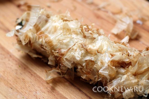 Обваливаем его в стружке тунца и нарезаем острым ножом на 6 частей. Края предварительно можно подрезать. Осталось скрутить остальные роллы по количеству порций, добавить васаби и маринованный имбирь и подать