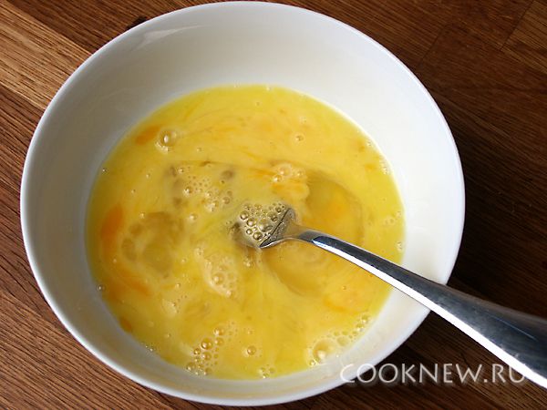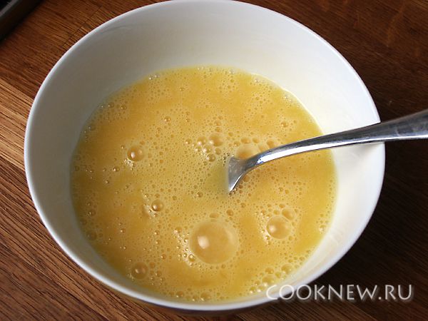 Ставим сковороду на огонь. Немного прогреваем на среднем огне и выливаем туда взбитые яйца
