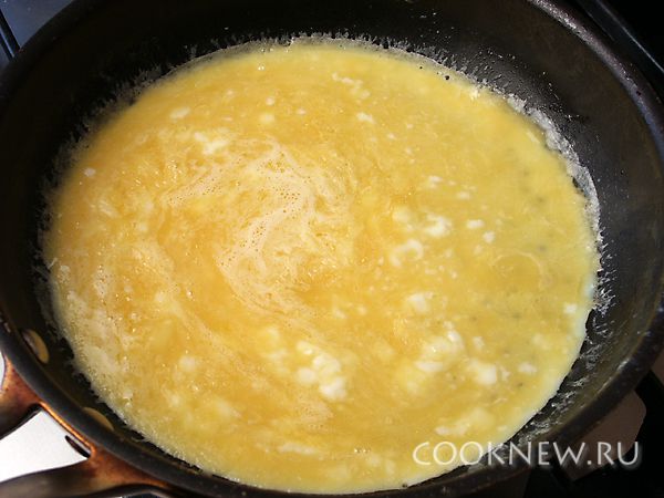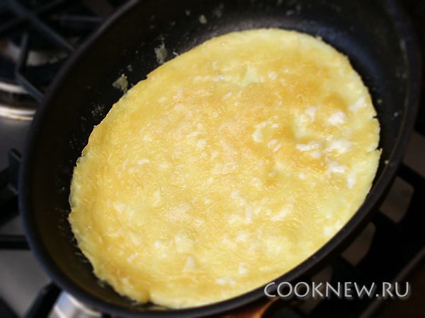 Время от времени покачиваем сковороду из стороны в сторону. Примерно через пять минут верхний слой загустеет настолько, что при наклоне сковороды на 30 градусов, он перестанет сползать вниз, а сползать начнет весь яичный блин. Однако если вы коснетесь ложкой поверхности омлета, то почувствуете, что он еще жидкий. Это как раз та самая консистенция, которая нам нужна.