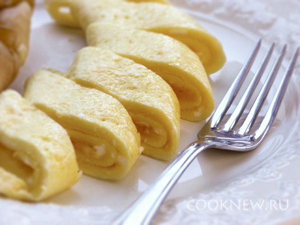 Тут же выключаем огонь и начинаем сворачивать омлет в трубочку. Сразу сбрасываем на тарелку.