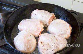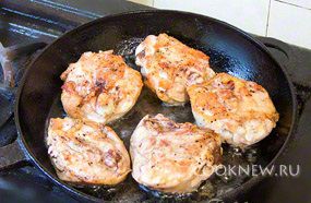 Хорошо разогреть сковороду (желательно чугунную), налить немного растительного масла без запаха и когда хорошо накалится выложить окорочка. Жарить на среднем огне 5 минут. Жарим без крышки