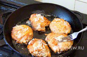Окорочка перевернуть на другую сторону и снова жарить около 5 минут до румяной корочки. В целом жарим курицу около 15-20 минут время от времени переворачивая. Готовность проверяем вилкой, мясо нужно проколоть до косточки — если выделяется красный кровяной сок жарим дальше, если прозрачный — мясо готово
