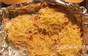Посыпать сыром. Запекать не менее 40 мин. при 160 градусах в предварительно прогретой духовке