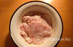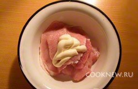 Отбитые стейки выложить в миску, добавить майонез (около 3 ст.л.)