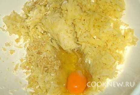 Сварите картофель в мундире. Затем натрите его на терке и добавьте яйцо.