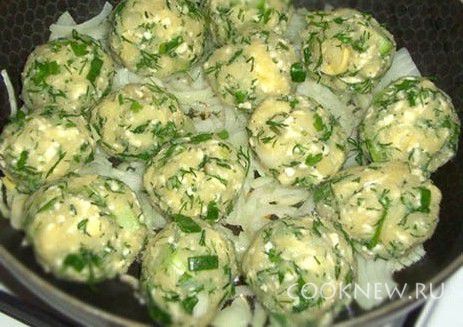 начинайте лепить тефтельки и выкладывать их сверху на лук. Пусть огонь будет средним, чтобы лук не горел, а тефтельки пропитывались его ароматом. Если вы лук не любите, то сможете его, потом просто отложить Когда сковорода наполнится тефтелями, накройте крышкой и подержите еще 5 минут, затем выключайте огонь