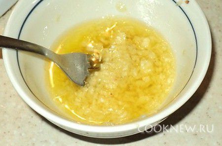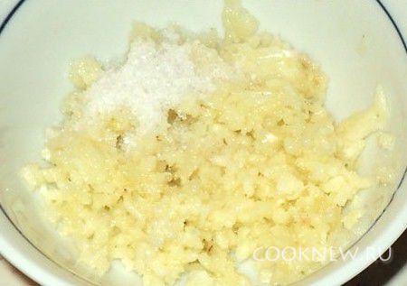 Приготовить чесночный соус. Для этого чеснок очистить и растереть с солью