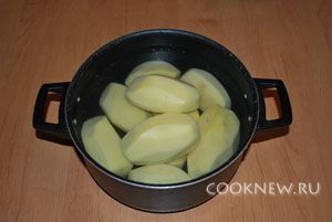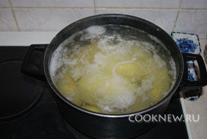 Пока чистим и режим картошку, ставим на плиту воду и доводим ее до кипения. Засыпаем картофель в кипящую, подсоленную воду (2 ч. ложки соли), и варим на средней температуре (среднем огне) 30 минут.
