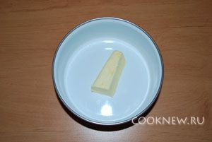 Пока картошка варится, готовим "начинку". Кусочек сливочного (несоленого) масла (примерно 50 гр.) выкладываем в мисочку, и ставим на плиту на медленную температуру (медленный огонь) - чтобы масло начало таять