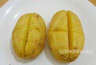 Чистим картошку от шкурки и глазков, если картошка крупная, советую ее разрезать, т.к. велика вероятность того, что она может быть внутри подпорчена (черные пятна, и другая ерунда), да и сварится быстрее