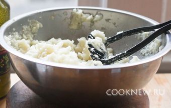 Добавляем в мятый картофель, уже приготовленную "начинку" (кипяченое молоко с маслом), и все еще раз толчем