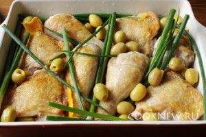 Разрезать зеленый лук, выложить вокруг куриного мяса. Сюда же добавить оливки и цедру апельсина. Все залить апельсиновым соком.