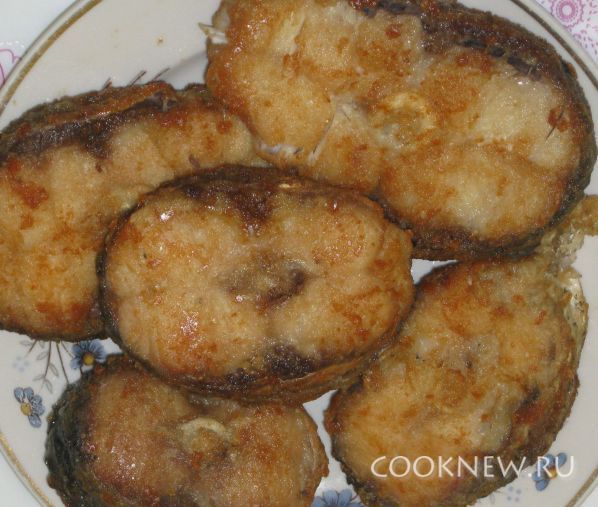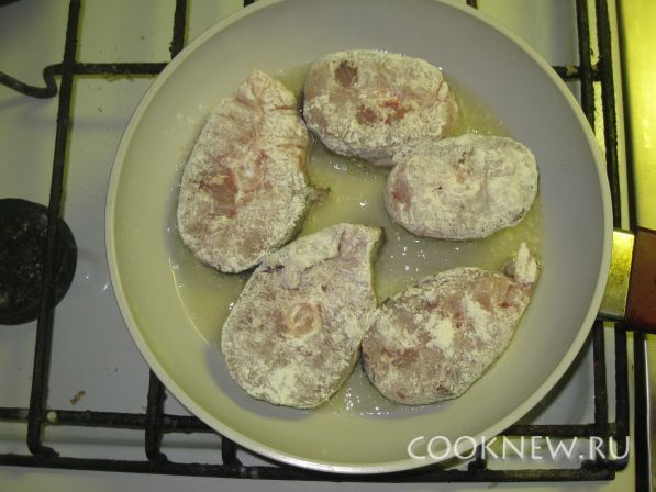 Обмакиваем кусочки во взбитом яйце, а после обкатываем в муке. Разогреваем сковороду и кладем в растительное масло рыбу