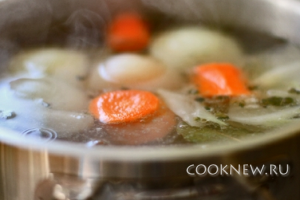 Чистим морковь и лук. Морковь режем на 2-3 части. Лук будем использовать целиком
