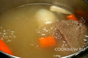 В кастрюлю закладываем говядину, морковь, лук. Наливаем холодной воды столько, чтобы наши продукты были полностью в воде. Ставим на огонь и ждем, пока закипит.