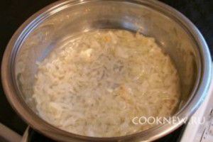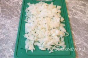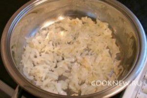 Затем обжарьте порезанный лук на растительном масле до золотистого оттенка.