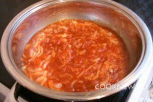 Следом добавьте томатную пасту или кетчуп, перемешайте, доведите до кипения и кипятите все минут 5. Затем уберите с огня.