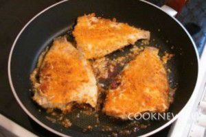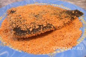 Когда натертая специями рыба постоит указанное время, обваляйте её в панировочных сухарях.
