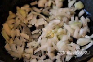 Разогрейте сковороду, затем влейте в неё растительное масло, нарежьте лук четверть кольцами и выложите в сковороду к разогретому маслу, жарьте до золотистого цвета