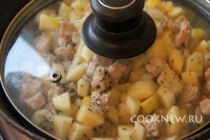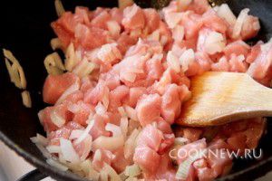 Нарежьте кубиками филе свинины, положите в сковороду к луку, перемешайте лопаткой. Тушите под крышкой на небольшом огне минут 30. Необходимо следить за количеством жидкости, мясо сразу выделит сок, а затем его впитает, если нужно – добавьте немного воды. Если у вас свинина жирная, можете жарить прямо на свином жиру, без добавления растительного масла