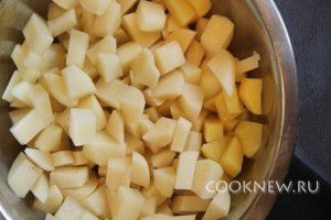 Почистите и помойте картофель, порежьте ломтиками или кубиками.