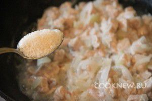 Добавьте 1 ч.л. соли в сковороду к мясу и луку.