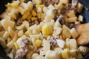 Высыпьте всю картошку, перемешайте, по желанию добавьте приправу. Также по желанию можно добавить морковь, нарезанную ломтиками или кружочками