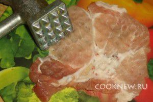 Тщательно моем свинину и режем на куски.Отбиваем каждый кусок, стараясь сделать его как можно тоньше, т.к. антрекот так лучше прожарится. Посолите и поперчите по вкусу куски свинины с обеих сторон.