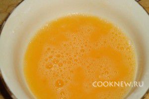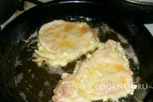 Затем обмоченные в муке куски мяса обмакиваем в смеси яйца, соли, перца и чеснока